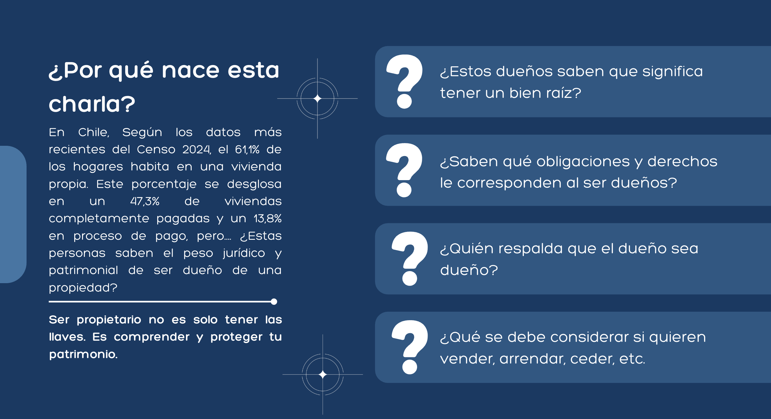 ESTA ES UNA CHARLA INTERACTIVA DONDE ADQUIRIRÁS EL CONOCIMIENTO ESENCIAL DEL DERECHO INMOBILIARIO EN CHILE, JUNTO CON LAS HERRAMIENTAS NECESARIAS PARA TOMAR DECISIONES INFORMADAS Y SEGURAS AL ADMINISTRAR, COMPRAR, VENDER O REGULARIZAR UNA PROPIEDAD, PROTEGIENDO TU PATRIMONIO.